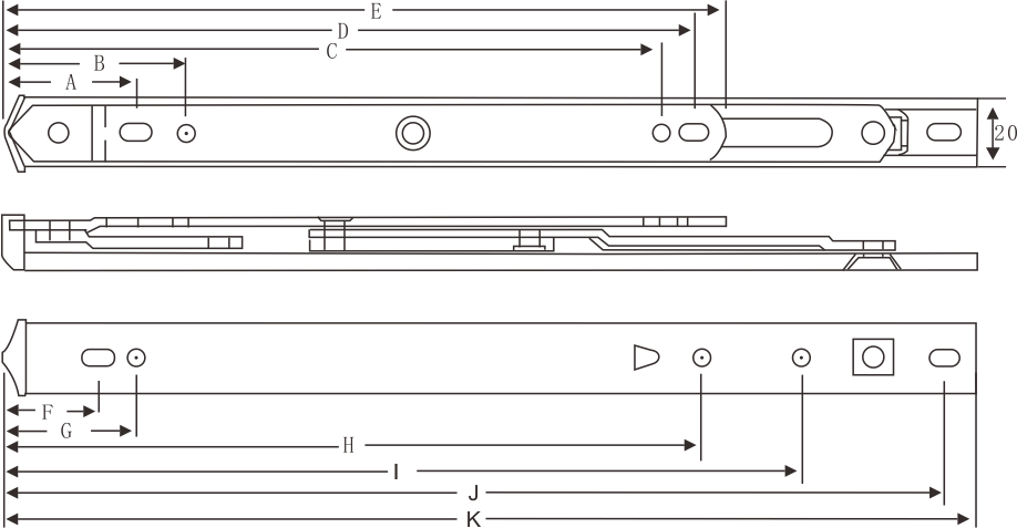連桿數量 | 折片厚度(mm) | 規格\值 | A | B | C | D | E | F | G | H | I | J | K | 窗最高(mm) | 窗最寬(mm) | 窗最重(kg) | 開啟角度(±2°) |