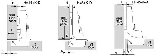 當確定了較鏈的最小間隙A后,根據確定的覆蓋程度D和鉸杯距離K,就能立刻從表格中查出底座高度H,更好的方法是,門的覆益距離D和鉸杯距離K要滿足表中底座高度H的要求。以某一款直臂為例:覆蓋距離D=19mm,鉸杯距離K=5mm,這時從表中查得H=0mm。而產品系統中的確有這種底座。當查出的底座高度 H在定貨系統中沒有與之對應的產品時,要用鉸臂上的薄蓋距離調整螺絲來調整覆蓋距離,以達到設計要求。